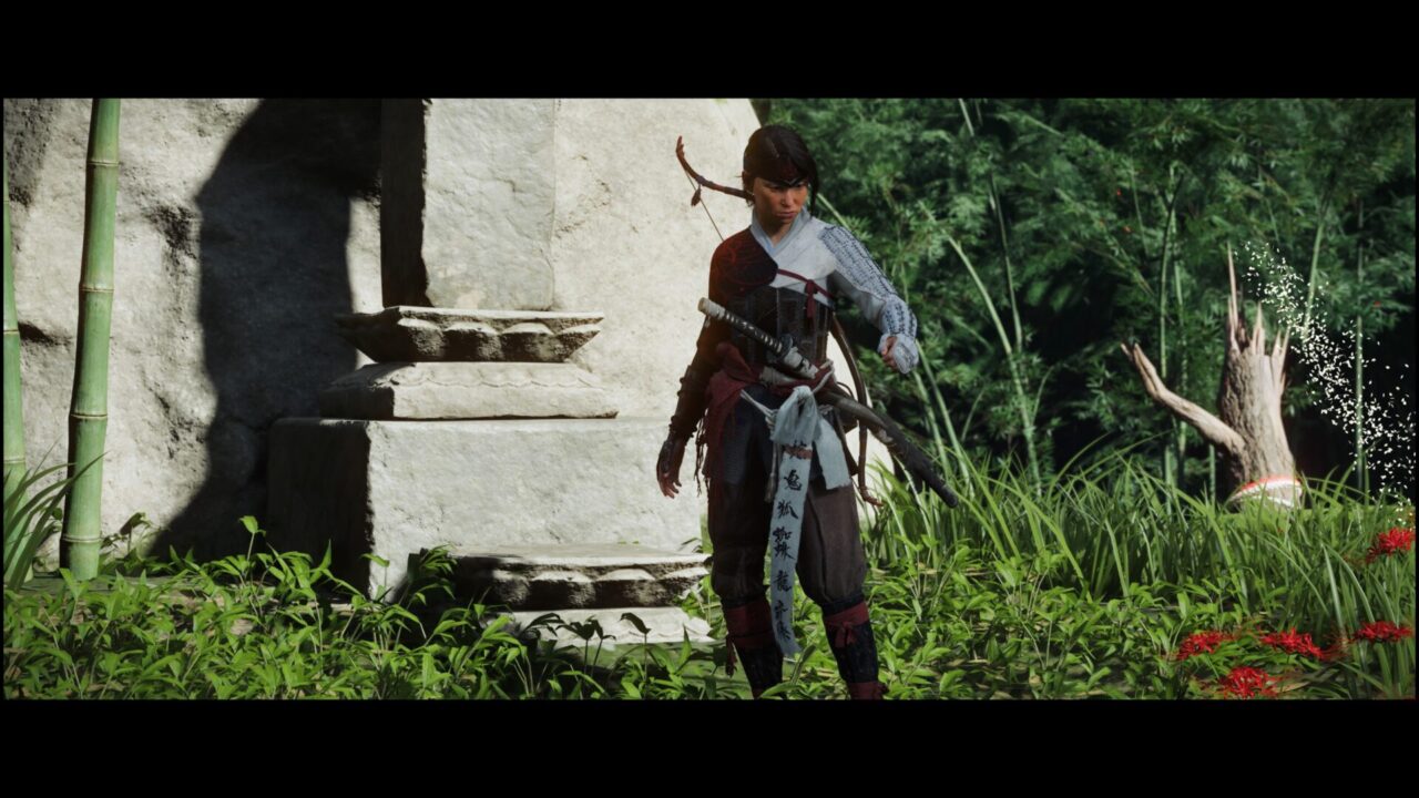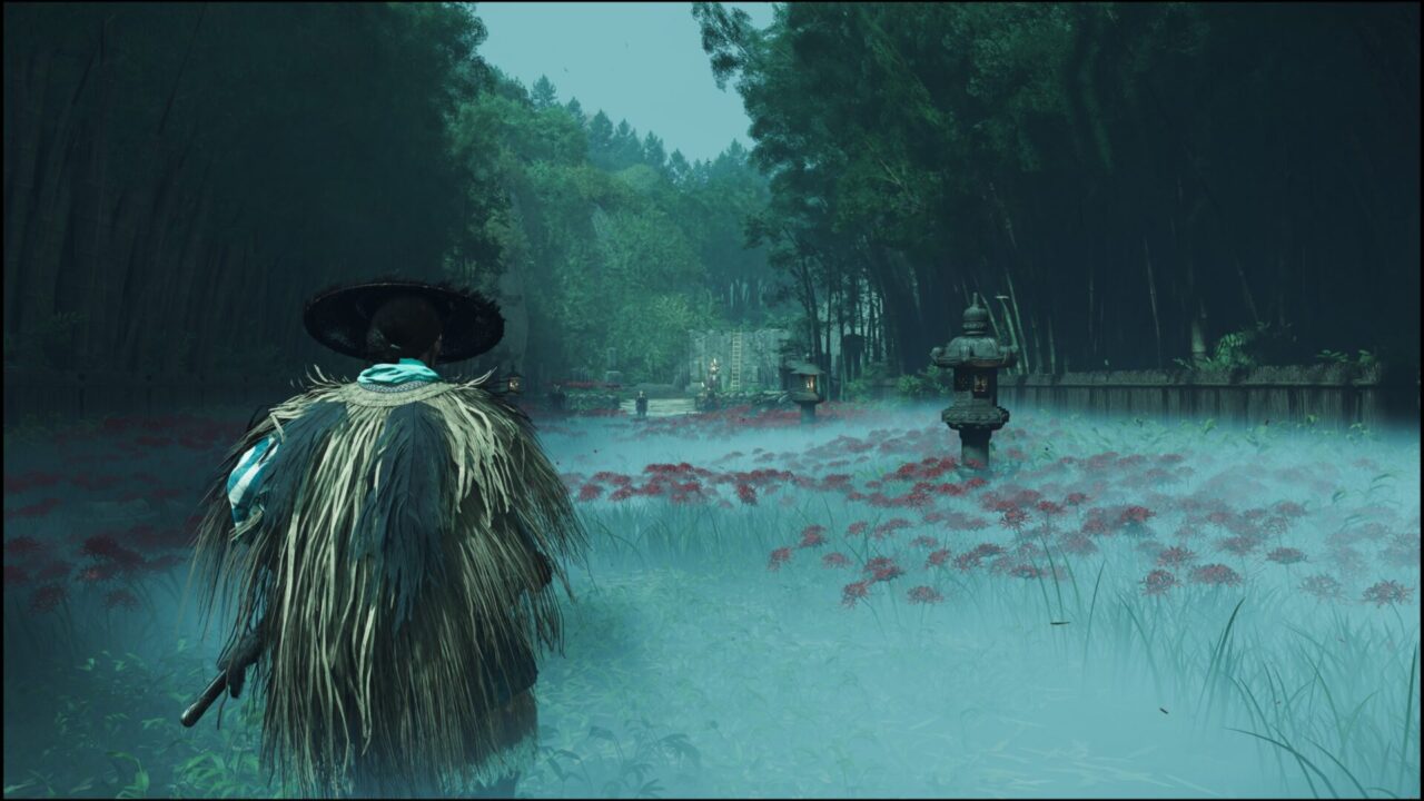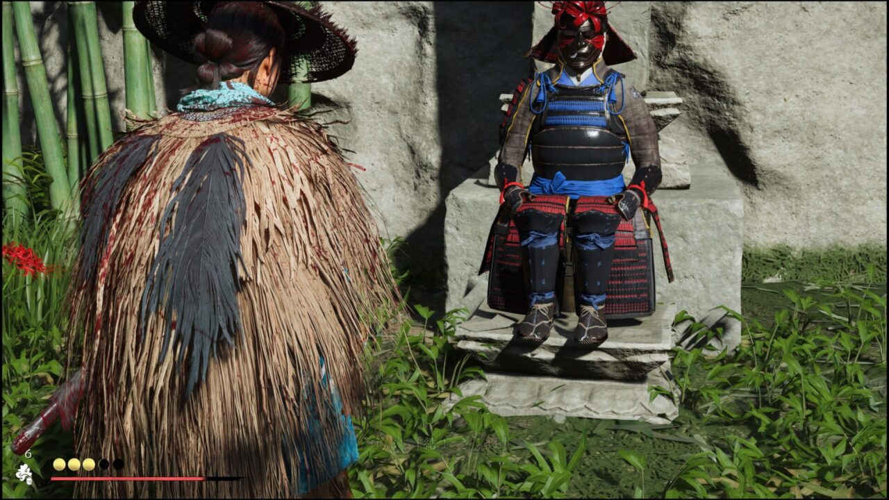 死人武者が去ったあと、あたりの霧は晴れて、墓前に鎧が置いてあった。先程、死人武者が着ていた鎧だ。色合いがどことなく LEGO っぽさを感じさせる。黄色が入っていたら完全にLEGOだった。兜の彼岸花もかなりファンキーなデザインをしている。