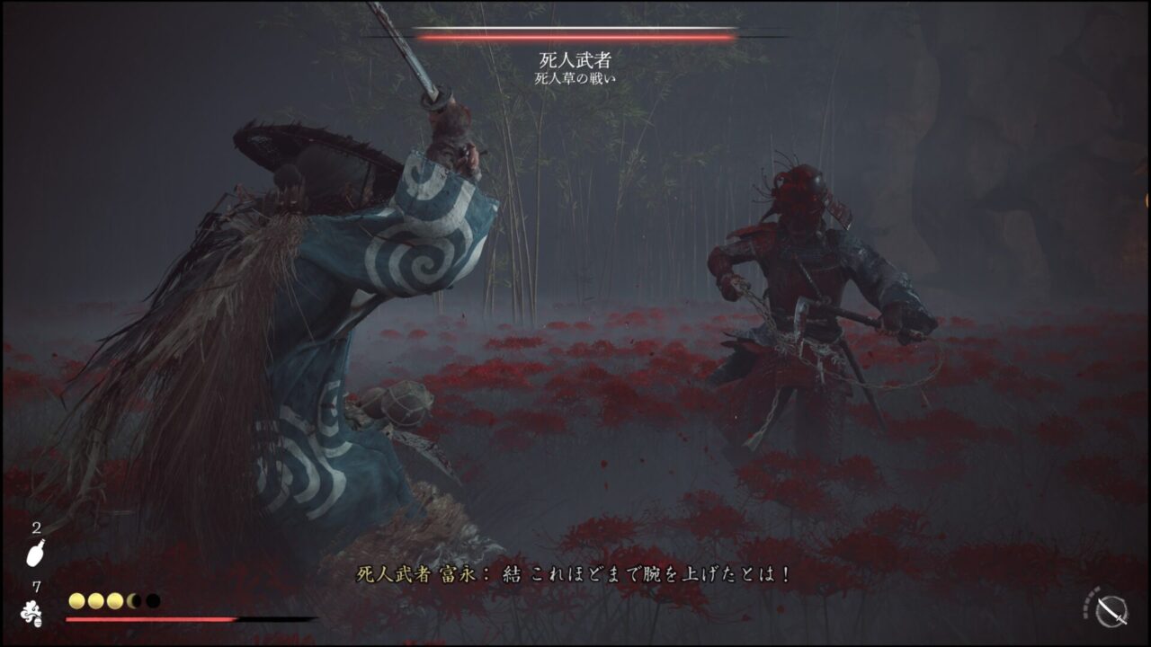 死人武者は娘を自分自身の手で死なせてしまった事を認められず、こうして誰彼構わず戦いを挑んでいるのだろう。もう居ないはずの娘を重ねて。その後悔は文字通り、死んでも死にきれないほどなのだろう。